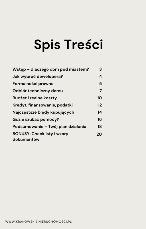 - 1. Czy ten ebook jest tylko dla rodzin kupujących dom po raz pierwszy? Ebook został stworzony jako praktyczny przewodnik dla młodych rodzin i osób, które marzą o domu pod miastem – Choć zawiera podstawy dla kupujących po raz pierwszy, to zawarte w nim praktyczne rady i checklisty (np. dotyczące weryfikacji dewelopera, szczegółowego odbioru technicznego i ukrytych kosztów) są wartościowe dla każdego, kto chce przejść przez proces zakupu bezpiecznie i świadomie.